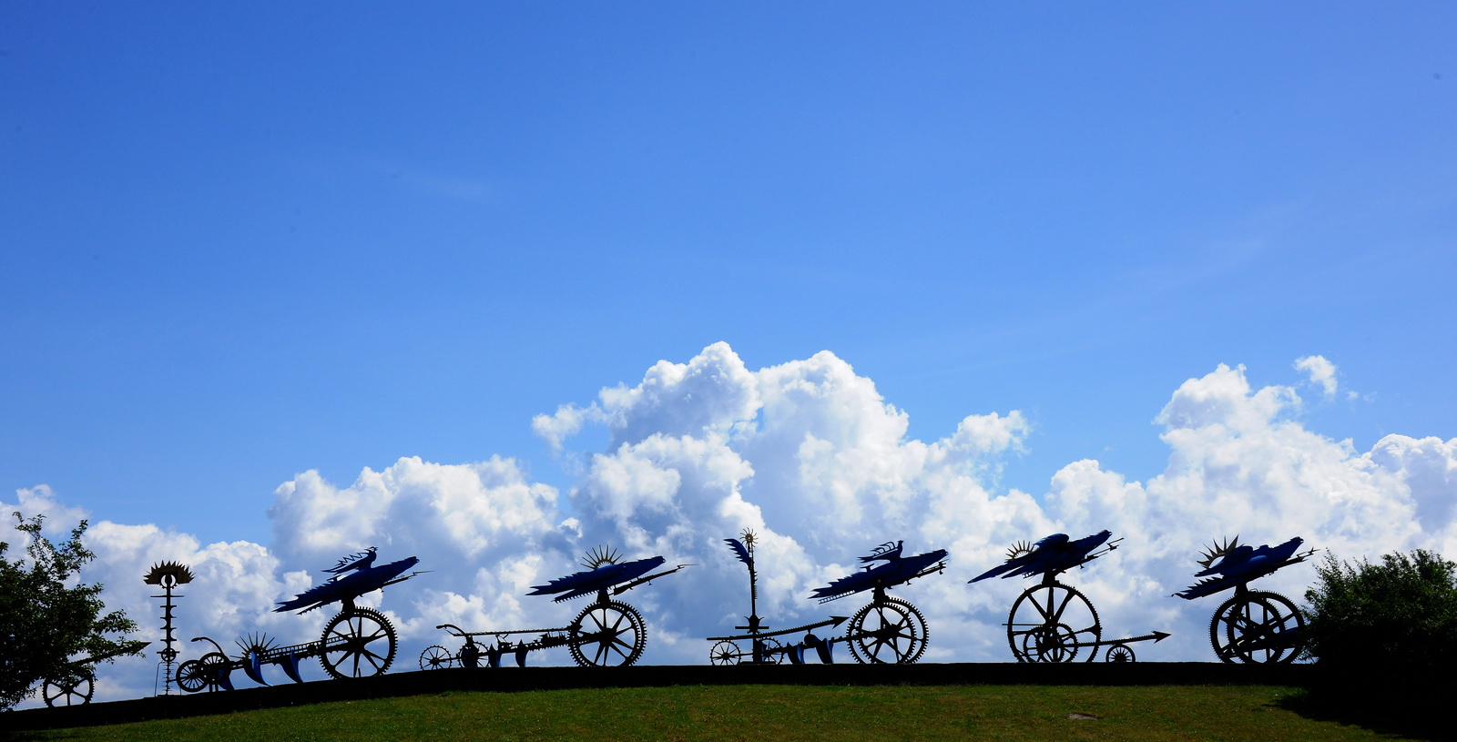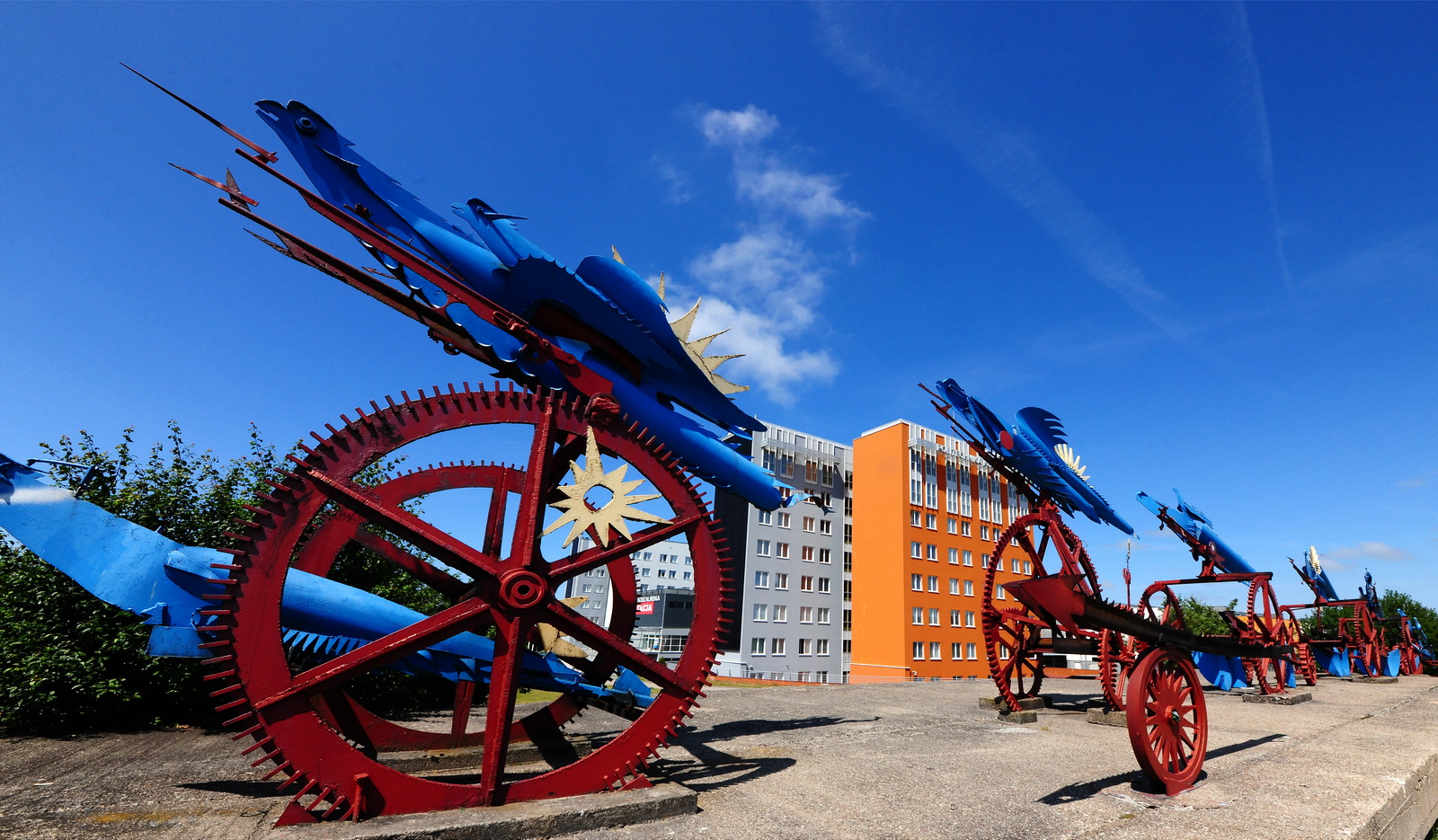 Dies ist eines der wertvollen und interessanteren Kunstobjekte in der Stadt. Die Installation besteht aus 24 Stahlvögeln und wurde 1977/78 von Władysław Hasior geschaffen, einem avantgardistischen Künstler und Bildhauer aus der Podhale-Region. Das Denkmal wird heute „Feuervögel” genannt und entstand, um den Anstrengungen des polnischen Soldaten, der 1945 Pommern eroberte, zu gedenken. Der formale Name lautet: „Denen, die um das Polentum und die Freiheit im Land Pommern kämpften”. Anfangs hatte die Metallkonstruktion eine grau-rostfarbene Farbgebung. Das 80 m lange Denkmal steht auf einer künstlichen, in etwa 6 m hohen Erhebung. Die Vögel sind eine dreidimensionale Darstellung von auf Streitwagen sitzenden Adlern, hinter denen mehrscharige Pflüge gezogen werden. Pfeile verbinden die Konstruktion miteinander und deuten flammende Geschosse an. Während wichtiger Feierlichkeiten, Ereignisse oder Veranstaltungen brennen die Vögel im wahrsten Sinne des Wortes, da die Konstruktion an das Gasnetz angeschlossen ist.