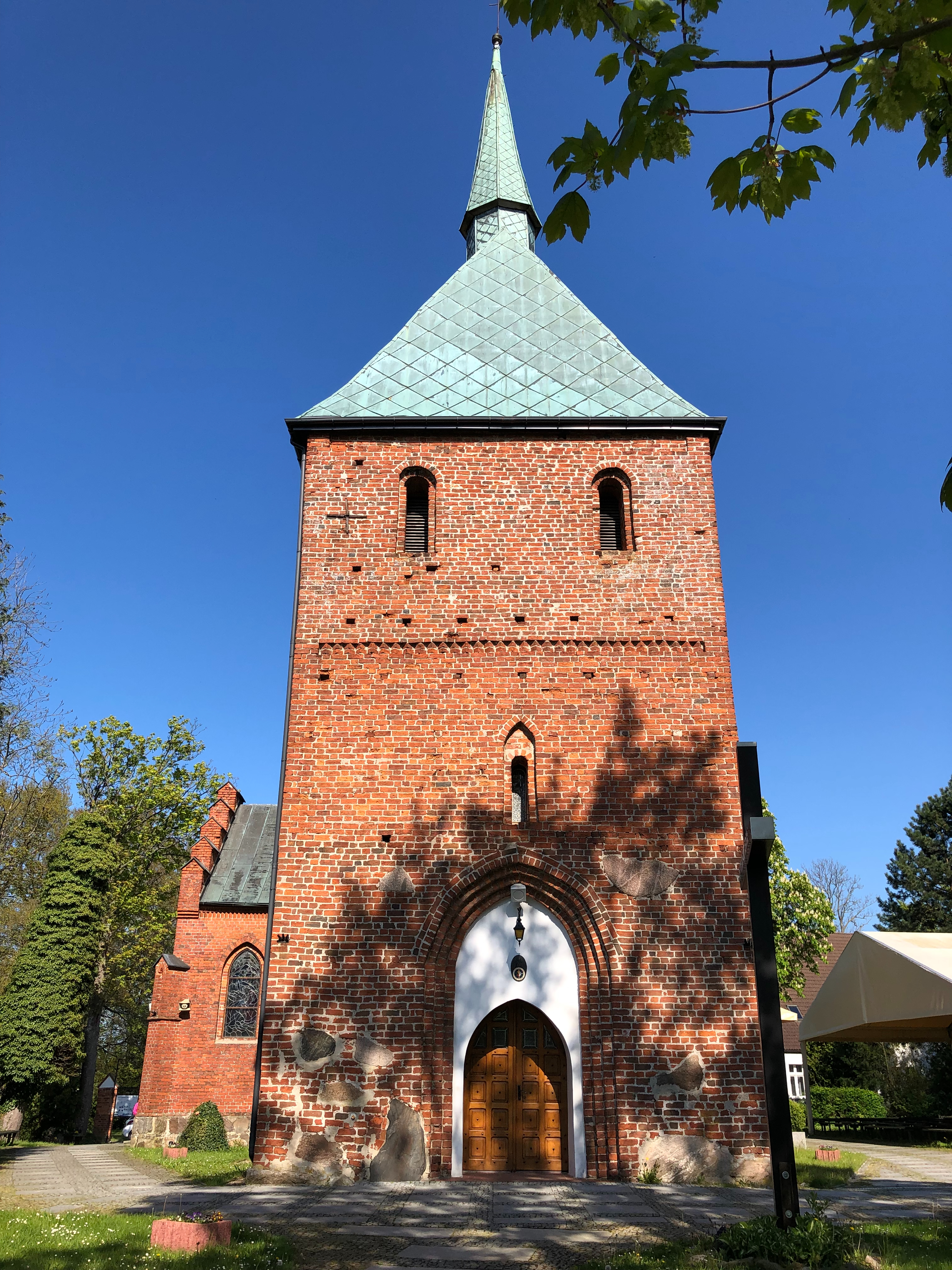 Interestingly, the steeple is over 100 years younger than the main nave. The church underwent multiple reconstructions, the last major one in 1856 when a Gothic Revival chancel was added. The church walls were built with millstones - a popular construction material in Pomerania. Pieces of the stones can be found above the Gothic portal of the church steeple.