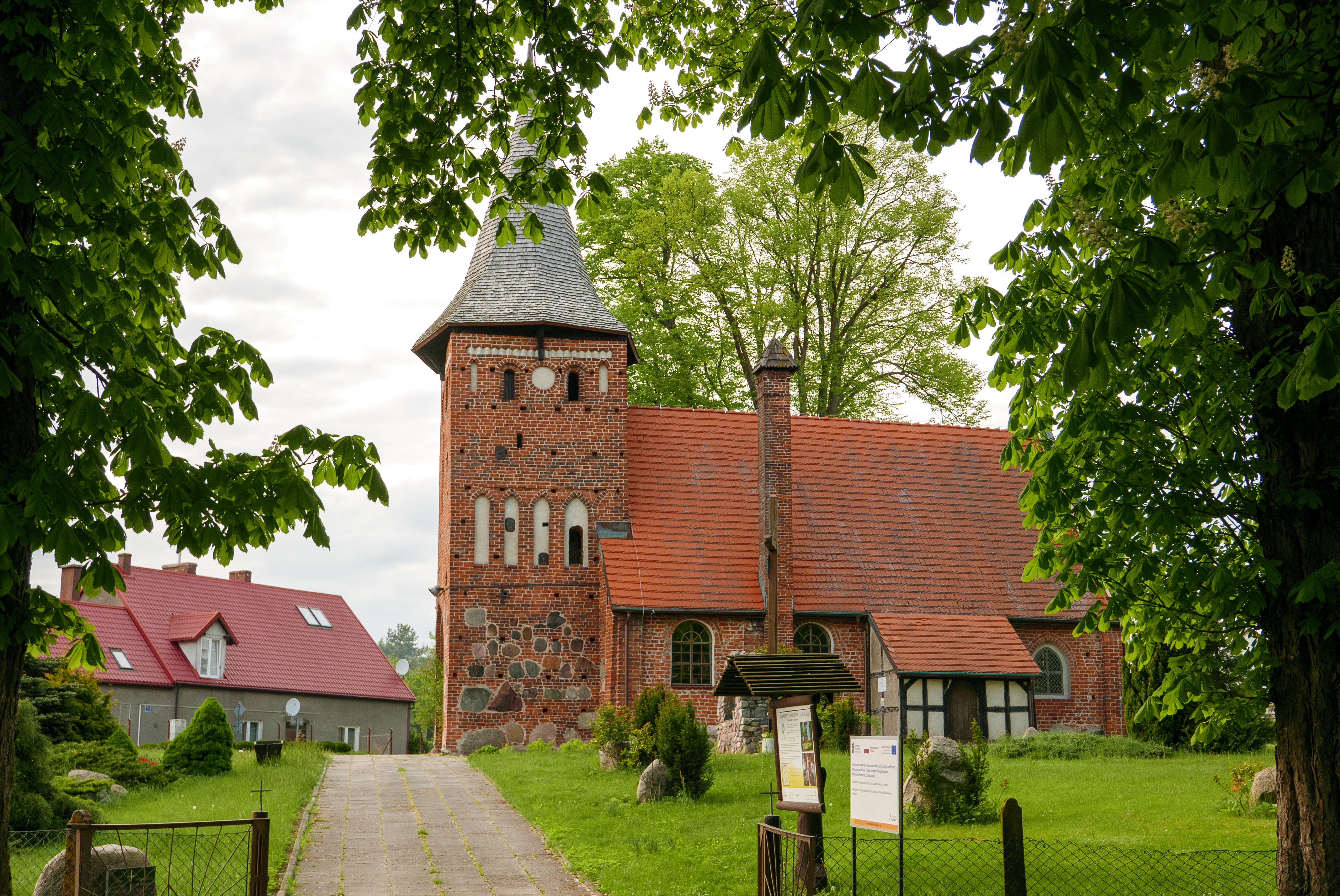 The church of the Feast of the Cross in Sucha Koszalińska is a Gothic temple built in the 15th and 16th century, with a very characteristic element, rarely seen in places of worship, namely, a chimney. It also has a half-timbered sacristy. The church itself was built with brick and boulders as a rectangular, single-nave temple. The steeple has a bell named Zuzanna dating back to 1600. Inside, you can see some preserved historic elements, such as the pulpit from 1729, a sandstone epitaph dated 1728 and funded by one Jacob Adrian von Heydebreck, the main altar from 1648 with the painting of the Resurrection and the Last Supper, as well as statues of saints. In the Protestant cemetery at the church, there is a preserved tombstone of a Pole named Andrzej Zawal, probably a forced labourer who died in Sucha Koszalińska in 1942.